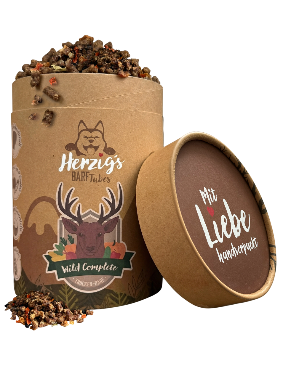Mit Herzig’s TrockenBARF WILD COMPLETE in reiner Premiumqualität bietest du deinem Hund eine vollwertige, natürliche und nährstoffreiche Ernährung auf Basis von Wild-Fleisch und -Innereien vom freilebenden Hirsch und Reh – daher auch völlig unbelastet mit Medikamenten oder Hormonen. Mit dem wichtigen Plus an vitamin- und ballaststoffreichem Obst und Gemüse.